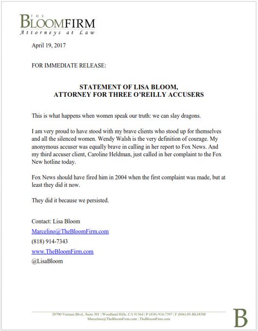 Bloom applauded O'Reilly's departure at the network just minutes after announcing that she had agreed to represent a third accuser in an ongoing pile-up of sexual harassment claims.