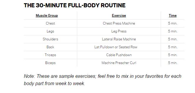 Some people just aren’t able to do 15 straight sets in a half-hour, probably because they’re accustomed to resting too long. This “choose-your-adventure” method requires you to train each body part in five-minute increments so you never lose track of time. For safety reasons, all the exercises are done on machines—you’ll probably fatigue quickly and will be working off of limited rest, and machines tend to be safer.